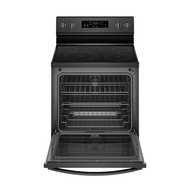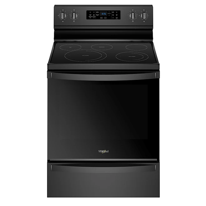 Get meals to the table faster with this Whirlpool electric range. It features five burners with two FlexHeat(TM) dual radiant elements that offer flexible cooking options to accommodate different sizes of pots and pans. Fan convection cooking eliminates cold spots and lets you bake on any rack with even heating, while Frozen Bake(TM) technology eliminates the need for preheating to get pizza, lasagna and other frozen favourites done faster. With the self-cleaning function, cleaning the oven is a hassle-free task.