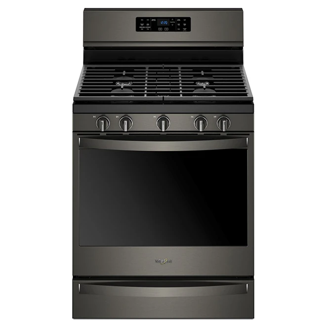 Have dinner ready in no time with this Whirlpool gas range. With the Frozen Bake(TM) function, you can eliminate preheating to get your get favourite meals to the table faster. The fan convection cooking eliminates cold spots for even heating, so you can get great results and bake on any rack. With EZ-2-Lift(TM) hinged grates that let you wipe underneath without having to remove them, spills are easy to clean up. The oven is also self-cleaning for effortless clean up.