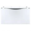 This Whirlpool(R) pedestal features an integrated drawer that allows you to store your laundry products or other items of your choice. Designed to raise you washing machine or dryer at a more comfortable working height for loading and unloading your appliances, this pedestal is 27″ wide, 15.5″ high, and 27.31″ deep. This item is sold individually, and the appliances are sold separately. This product is backed by a 1-year limited warranty on parts and labour.