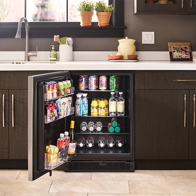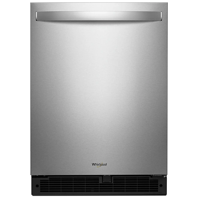 This Whirlpool(TM) refrigerator is designed to be installed under the counter. Store food and beverages the way you like them with customized temperature selection ranging anywhere from 5 to 17.7°C (41 to 64°F). Keep items at their ideal temperature with an alert that lets you know if the temperature is rising or cold air is escaping through an open door. Choose the ideal temperature with convenient, up-front controls. The LED interior lighting keeps food looking as good as it tastes. Get a clean, streamlined look that complements any suite of appliances with the large bar handle. The reversible stainless-steel door accommodates unique spaces. Hide fingerprints and smudges with stainless steel that easily wipes clean. The refrigerator is backed by a 1-year limited warranty on parts and labour. It is also backed by a 2nd – 5th year limited warranty on cavity liner and sealed refrigeration system.