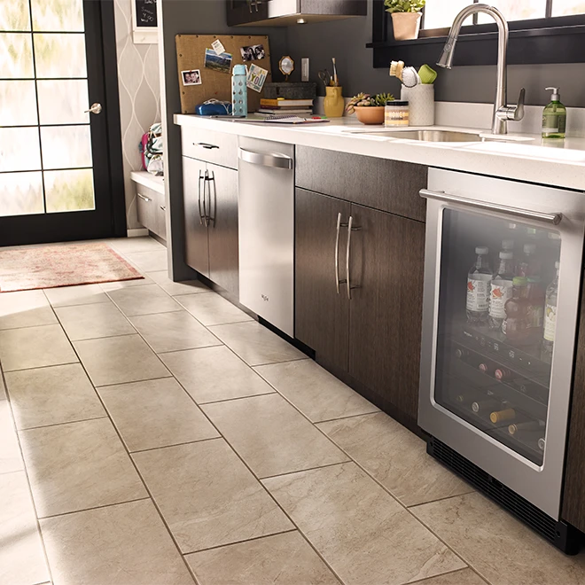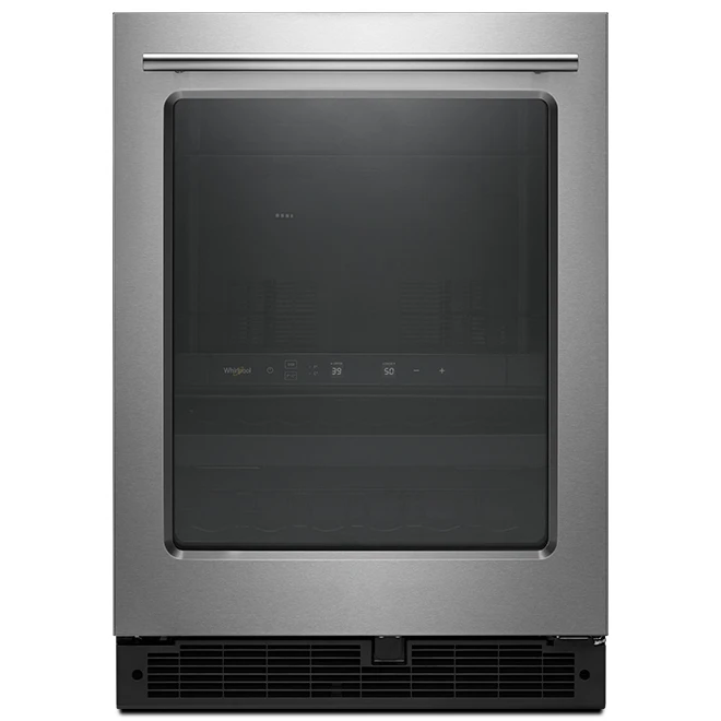 This Whirlpool(R) wine cooler conveniently stores up to 14 bottles in a dual-temperature controlled zone. Keep wine on the lower racks at 5.5 – 12.7°C (42 – 55°F) and other beverages above 0.5 – 5.5°C (33 – 42°F). Choose the ideal temperature for whatever you’re storing with convenient, up-front controls. The appliance is equipped with LED interior lighting keeps drinks looking as good as they taste and a temperature sensor alert that lets you know if the temperature is rising or cold air is escaping through the open door. The finish hides fingerprints with stainless steel that easily wipes clean. The towel bar handle provides a clean, streamlined look that complements any suite of appliances. Install the glass door on either side to accommodate unique spaces. The wine cooler is backed by a 1-year limited warranty on parts and labour.
