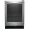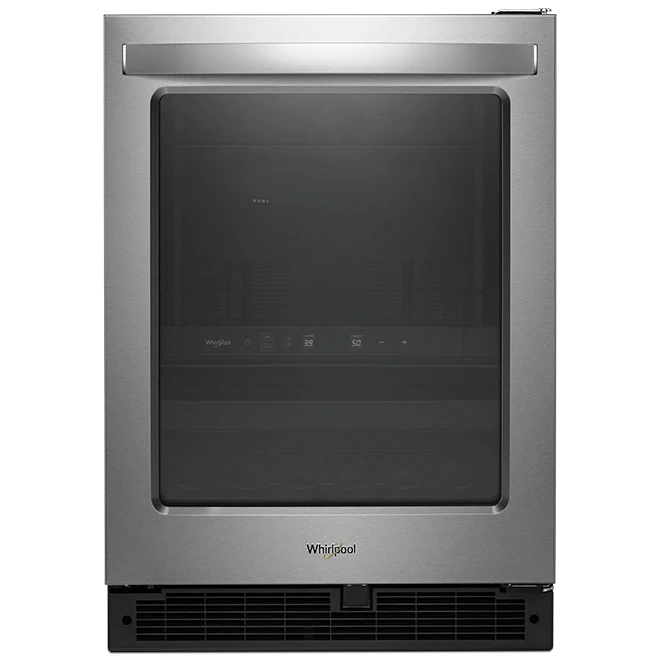 This Whirlpool(R) wine cooler conveniently stores up to 14 bottles in a dual-temperature controlled zone. Keep wine on the lower racks at 5.5 – 12.7°C (42 – 55°F) and other beverages above 0.5 – 5.5°C (33 – 42°F). Choose the ideal temperature for whatever you’re storing with convenient, up-front controls. The appliance is equipped with LED interior lighting keeps drinks looking as good as they taste and a temperature sensor alert that lets you know if the temperature is rising or cold air is escaping through the open door. The finish hides fingerprints with stainless steel that easily wipes clean. The large bar handle provides a clean, streamlined look that complements any suite of appliances. Install the glass door on either side to accommodate unique spaces. The wine cooler is backed by a 1-year limited warranty on parts and labour.