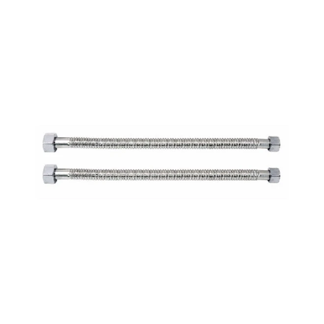 Set of 2 18 in stainless steel connectors for water softener. They feature a 3/4 in female pipe thread end and a 1 in female pipe thread end. They are flexible and durable and come with detailed instructions to install them properly.