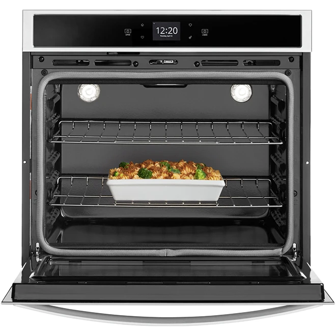 As efficient as it is elegant, the Smart wall oven from Whirlpool(TM) will simplify your life. The touchscreen provides instant access to settings your family uses most. You can also have hands-free control of our built-in wall oven using voice control so you can still get other things done. The connected features let you send cooking instructions to the oven from your smartphone, control your kitchen with voice commands through a smart home assistant or skip preheating. Get instant access to the settings you use most with an all-new touchscreen that learns, adapts and suggests customized presets based on your family’s routines. You can also make multi-step meals simpler, using your smartphone or tablet to send multiple cooking instructions to the oven all at once, the temperature automatically adjusts based on the recipe you enter for great results without having to monitor your meal. Get evenly baked food with a sensor that monitors oven temperature and adjusts the cooking elements. The Rapid Preheat feature heats up the oven 20% faster. Use the Frozen Bake technology to cook frozen food with preprogrammed settings that automatically adjust cooking times so you can get select dinner items from the oven to the table faster.