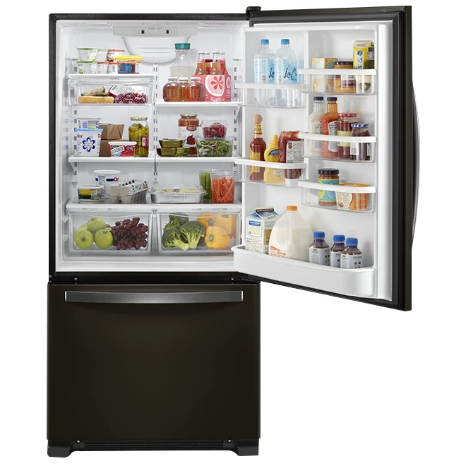 This Whirlpool bottom freezer refrigerator will fully meet your storage needs for the entire family when it comes fresh and frozen foods. With a capacity of 22.1 cu ft, it features 2 humidity-controlled crispers, a deli and cheese drawer and multiple adjustable door bins. Food freshness will be greatly extended thanks to the FreshFlow produce preserver which filters ethylene gas emitted by most fruits and vegetables. In addition, the appliance is equipped with the Accu-Chill temperature management system which detects temperature changes and makes appropriate adjustments. Finally, cleaning the refrigerator won’t be a hard task thanks to the easy-to-wipe stainless steel exterior and spillproof glass shelves. Backed by a 1-year limited warranty on parts and labour.