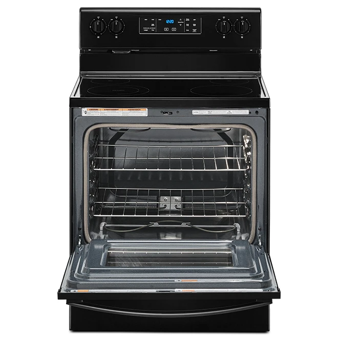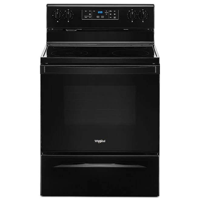 Churn out hot meals fast with this Whirlpool electric range with Frozen Bake technology. It has a black finish to complement your kitchen aesthetics. This electric range has Frozen Bake tech for cooking chilled foods without preheating the oven. The 5.3 cu. ft oven is ideal for cooking for large families. A self-clean function puts oven sanitising on autopilot. Equipped with touch controls and rotary knobs, this freestanding single oven provides a balanced mix between precise control and intuitive operation. The 30-inch wide appliance has a flat ceramic glass cooktop with raised edges to simplify cleanup. With four electric elements, this oven with a storage drawer lets you prepare large meals. One element is adjustable between 6-in D through 9-in D to accommodate small and large pans. This unit comes with a 1-year limited warranty. A keep warm setting maintains your food at serving temperature.