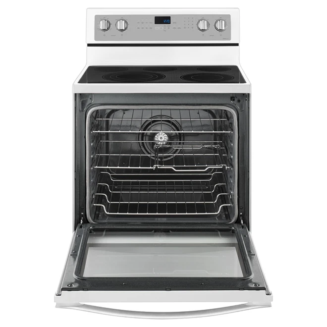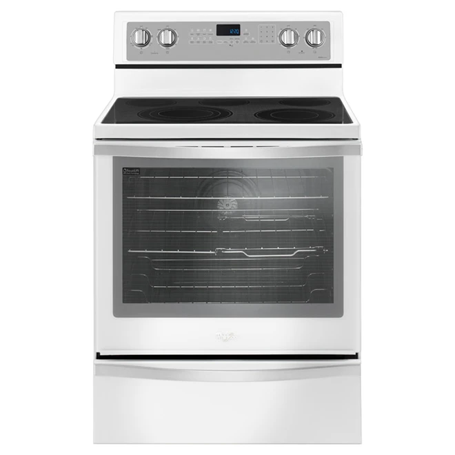 Get perfectly cooked food with this modern electric range from Whirlpool! It features true convection to cook food quickly by using a rear fan and a third heating element. It also allows you to skip the preheating step and go straight to baking. Furthermore, the oven uses automatic convection conversion technology to adjust cooking temperatures for more consistent heat distribution. The stove section has 5 burners, including the FlexHeat triple radiant element, which is like having 3 elements in 1. It fits small pots and pans, as well as larger cookware. Moreover, this range cleans itself with AquaLift self-cleaning technology, which uses only water and low heat to remove baked-on foods. This appliance has a 6.4 cu. ft. capacity and comes with a 1-year limited warranty on both parts and labour.