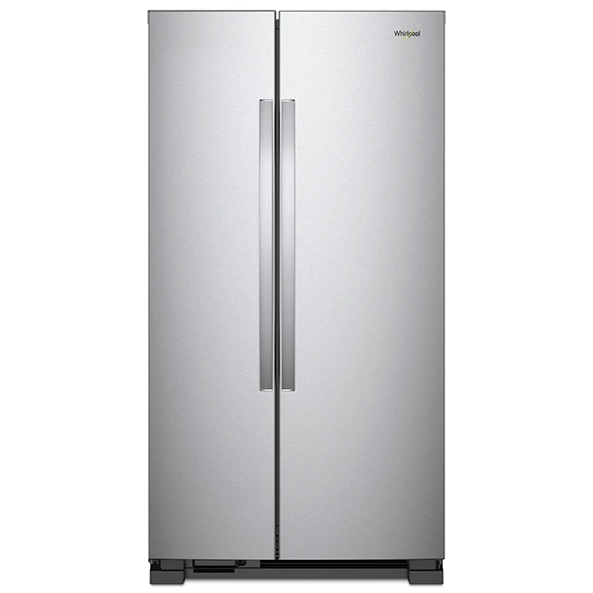 This Whirlpool side-by-side refrigerator offers a place for all your groceries. The fridge has frameless glass shelves that can hold more items and be adjusted for taller items. This model includes door bins for gallon items, a compartment for dairy, a deli drawer, and a humidity-controlled crisper that extends the freshness of fruits and vegetables. Choose the ideal temperature for whatever food you’re storing with clear and simple electronic controls. Bright LED lights illuminate this fridge’s content so you can find what you need in a blink of an eye. The freezer keeps frozen foods organized with shelves, door bins, and a drawer. This stainless steel model is covered by a 1-year limited warranty on parts and labour. An optional icemaker can be ordered and it fits into the freezer.