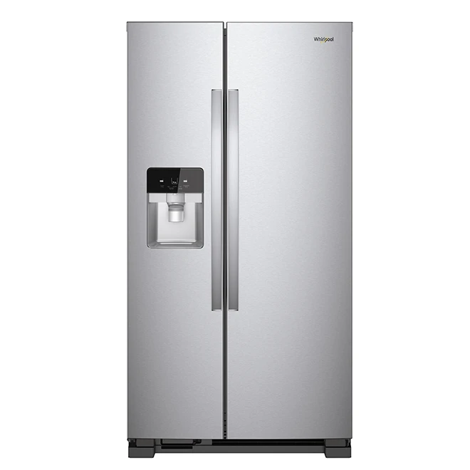 With tap touch controls and a beautiful stainless steel exterior, this side-by-side refrigerator from Whirlpool will bring a modern touch to your kitchen. This appliance is equipped with an exterior water and ice dispenser, and offers plenty of storage options thanks to frameless glass shelves, a deli drawer, adjustable door bins, humidity-controlled crispers, and a can caddy. It has an overall capacity of 24.5 cu ft (the refrigerator capacity is of 15.4 cu ft, and the freezer capacity, of 9.1 cu ft). In addition, the freezer features an adaptive defrost system that saves energy by running the cycle only when necessary. This model comes with a 1-year warranty of parts and labour.