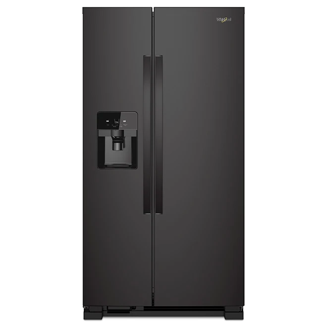 Whirlpool’s side-by-side freezer-fridge model in a sleek black exterior featuring touch controls and a beautiful black exterior is a great choice for anyone looking to upgrade their kitchen appliances. It is equipped with an exterior water and ice dispenser, tap touch controls, LED lighting, and plenty of storage options like frameless glass shelves, a deli drawer, adjustable door bins, humidity-controlled crispers, and a can caddy. Lastly, the freezer includes an adaptive defrost system that saves energy by running the cycle only when necessary.