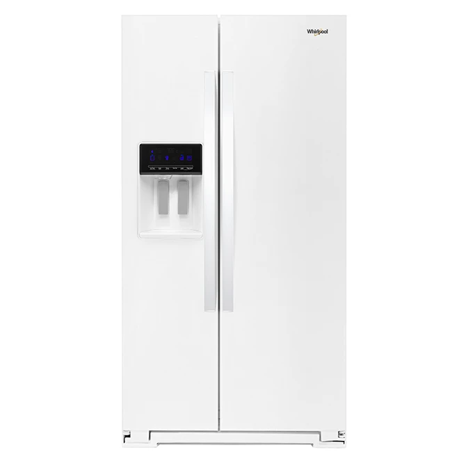 This Whirlpool refrigerator offers a total capacity of 28-cu ft and features a side-by-side freezer that allows you to see its content easily. The beautiful white exterior resists fingerprints and is equipped with a convenient ice and water dispenser. The Accu-Chill system automatically adapts to optimize temperatures, while bright LED lighting provides great visibility inside and on the dispenser. Additionally, the freezer features the In-Door-Ice storage that lets you move the ice bin to the door to free up shelf space.