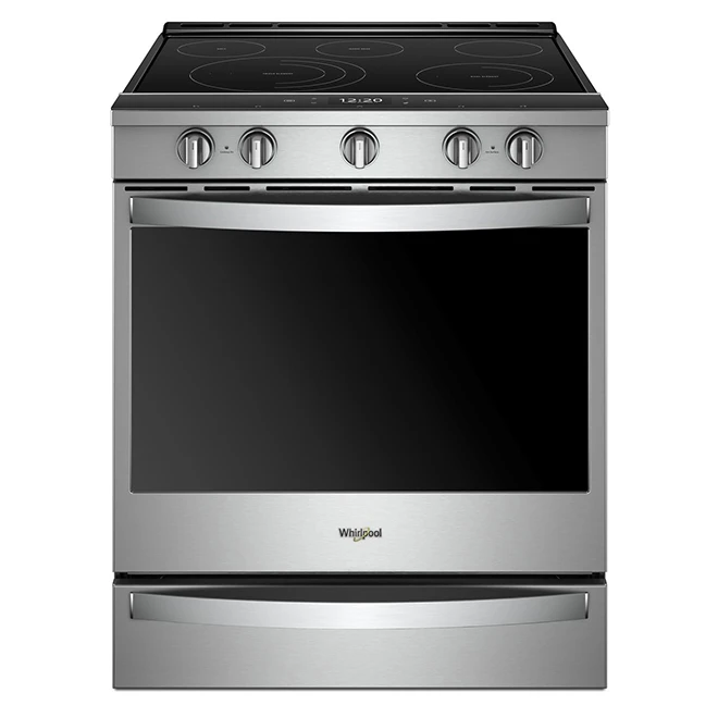 The slide-in design of this Whirlpool electric range fits in effortlessly with your kitchen cabinets to help you achieve a built-in look with no complicated set-up. This convenient electric range features smart technology that lets you start the oven remotely and program multi-step meals. The Frozen Bake function lets you skip the preheating step by adjusting cooking time accordingly. The stovetop has 2 FlexHeat dual elements that give you flexible options for pots and pans of all sizes, while touch control lets you manage settings with ease. Enjoy true convection with the oven’s 3rd element and fan that distributes hot air evenly.