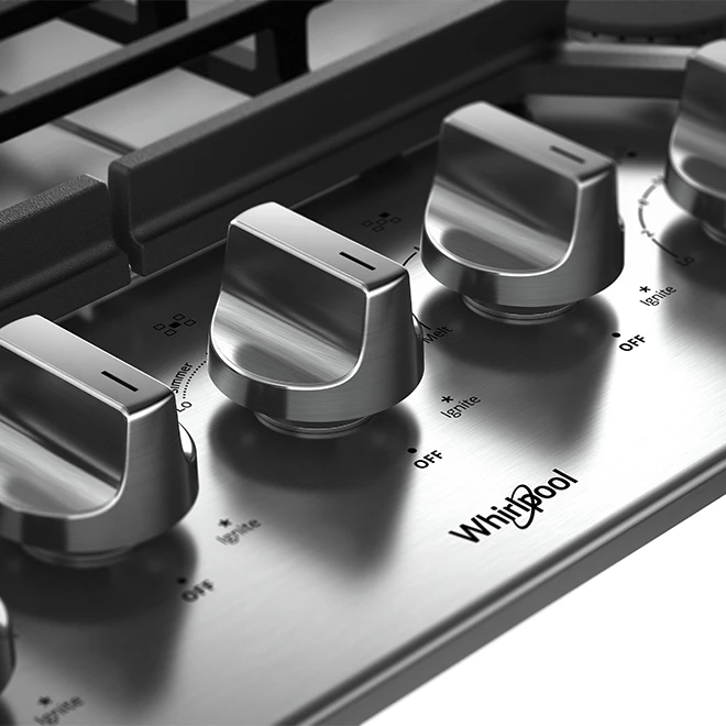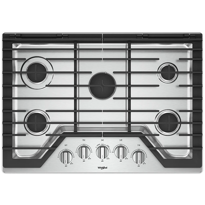 This Whirlpool(TM) professional 30″ cooktop gives you space and versatility for the preparation of your daily meals. Continuous cast-iron grates are equipped with EZ-2-Lift hinges, which are specifically designed to lift grates without having to remove them, giving you quick access to spills. SpillGuard(TM) upswept edges prevent liquids from spilling out of the cooktop. For even more thorough cleaning, you can safely put the grates in the dishwasher. The SpeedHeat(TM) burner generates the high temperature needed for boiling water and stir-frying food, while the AccuSimmer (R) burner with power reduction function provides better control at low temperatures, which is ideal for simmering sauces. Burners are sealed to prevent food from falling inside, meaning that cleaning is child’s play. For greater versatility, you can install this cooktop near a wall oven or separately. Backed by a 1-year limited warranty, parts and labour.