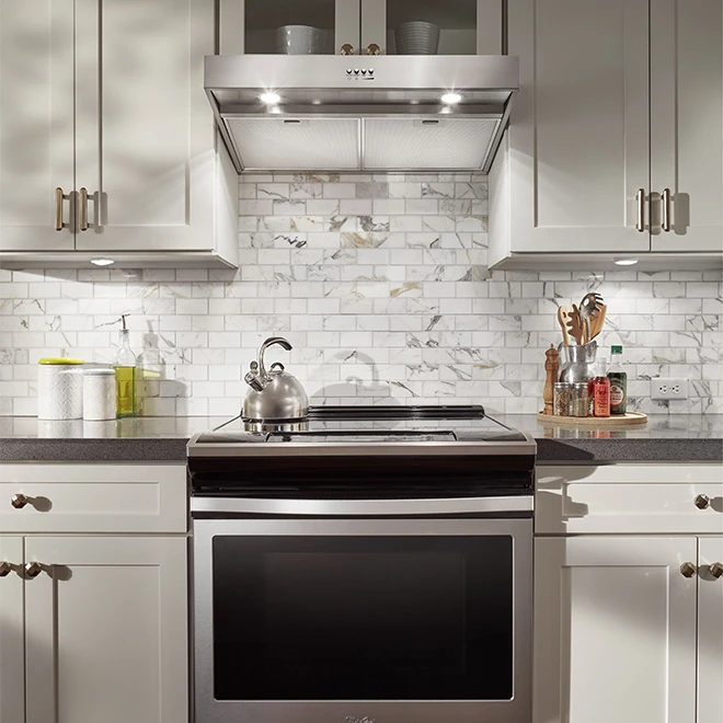 This Whirlpool(R) range hood helps you to keep noise down in the kitchen with the quiet operation of 65 dBA at the hood’s highest speed. The 3 fan speeds provide the right amount of ventilation for every meal you prepare. Thanks to the FIT system, you no longer need to measure, cut and trim to get the perfect fit every time. By not having to connect it to outside air, this hood can be installed almost anywhere, including a condo. The hood is backed by a 1-year limited warranty on parts and labour.
