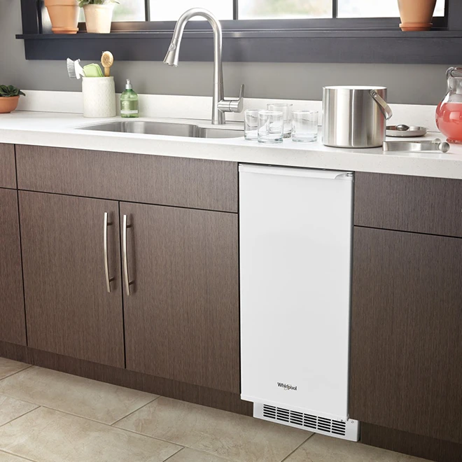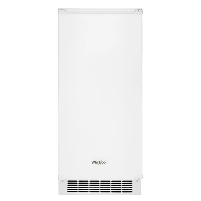 You can install this Whirlpool white ice maker under a counter or on its own, thanks to its venting system. It has a 25-lb. capacity to ensure you’ll always have ice on hand, and even if you do happen to run out, you’ll be able to make a new batch of perfectly shaped ice cubes in a flash thanks to this machine’s Fast Ice option. This ice maker also features a reversible door as well as electronic touch controls and LED lighting. It even has a self-clean cycle to prevent mineral scale build up and make cleaning a breeze.